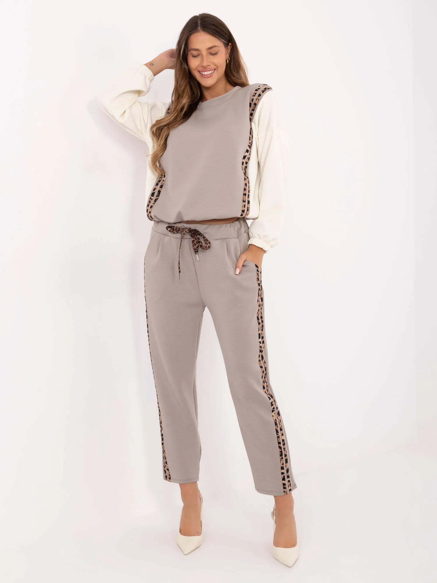 Komplekto matmenys vieno dydžio: plotis po pažastimis - 61 cm, megztinio ilgis - 61 cm, rankovių ilgis - 43 cm (nuo siūlės), plotis apačioje - 36 cm, kelnių plotis ties juosmeniu - 33 cm (ištiesus plokščiai), kelnių plotis ties juosmeniu - 57 cm (po tempimo), klubų plotis - 52 cm, kelnių ilgis - 89 cm.