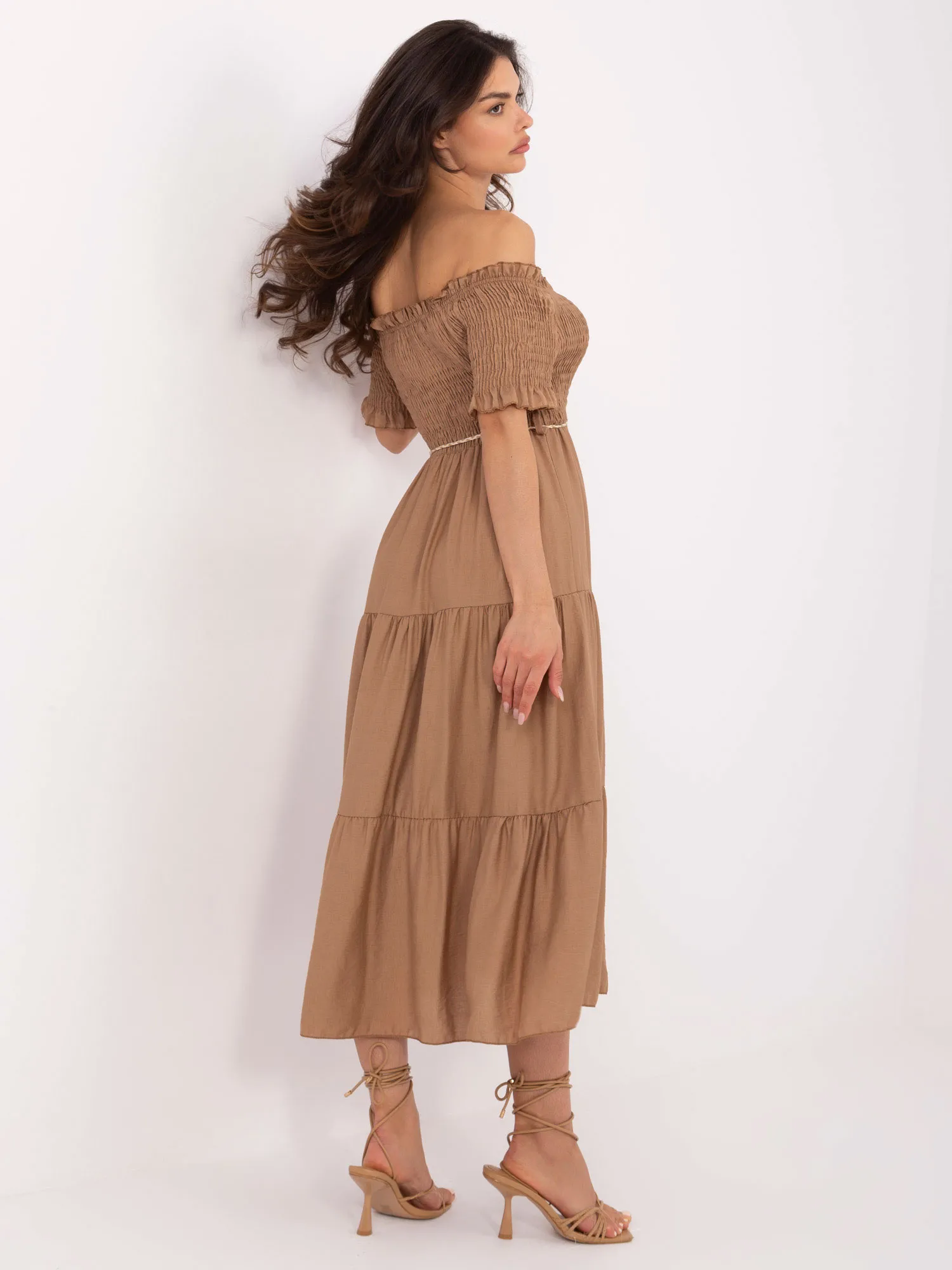 Suknelės matmenys vieno dydžio: plotis po pažastimis - 34 cm (ištiesta plokščiai), plotis po pažastimis - 70 cm (po tempimo), juosmens plotis - 33 cm (ištiesta plokščiai), juosmens plotis - 68 cm (po tempimo), klubų plotis - 60 cm, rankovių ilgis - 21 cm, bendras ilgis - 111 cm.