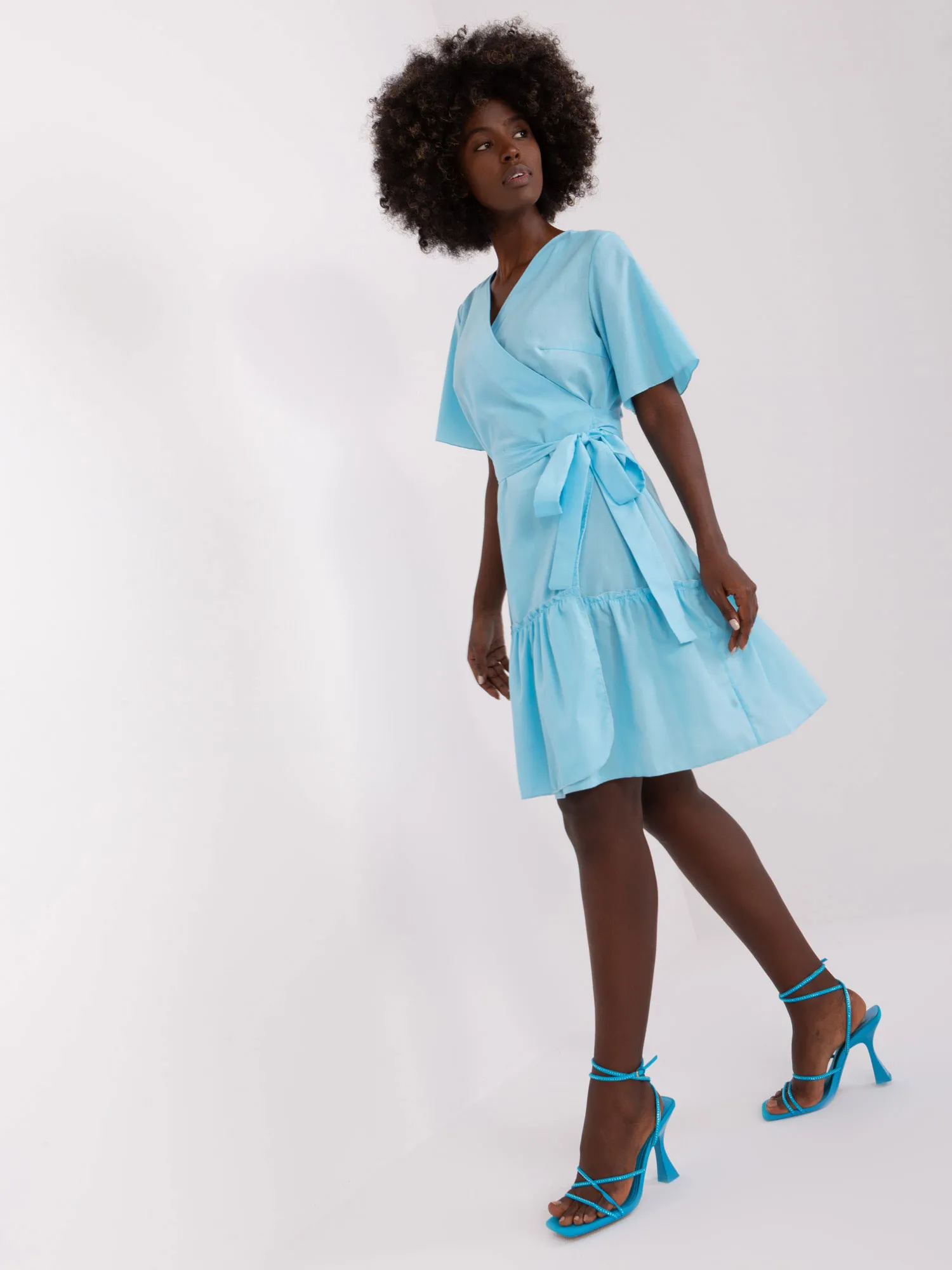 Šviesiai mėlyna medvilninė suknelė su raukiniais .
