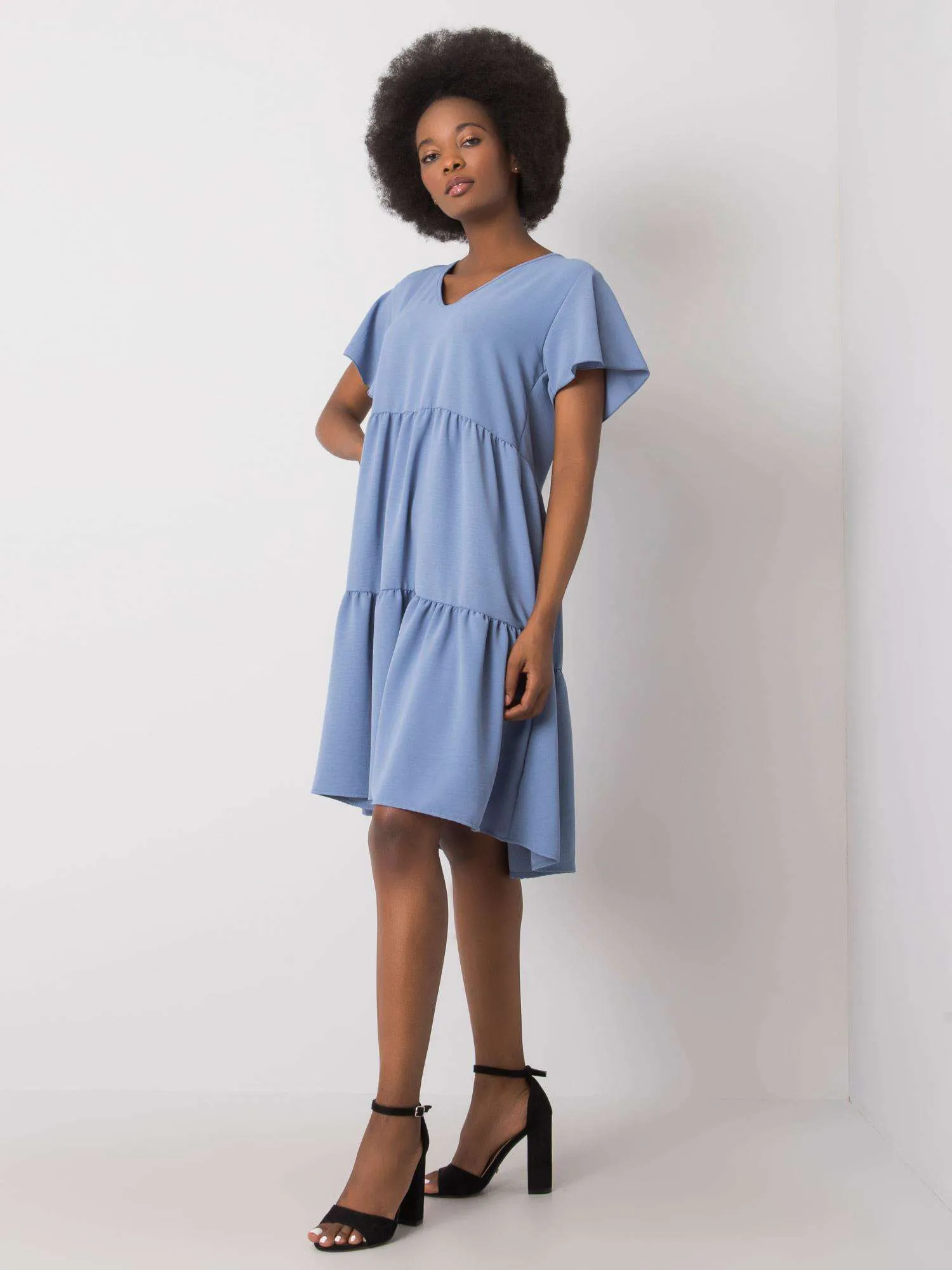 RUE PARIS Mėlyna moteriška suknelė su raukiniais .