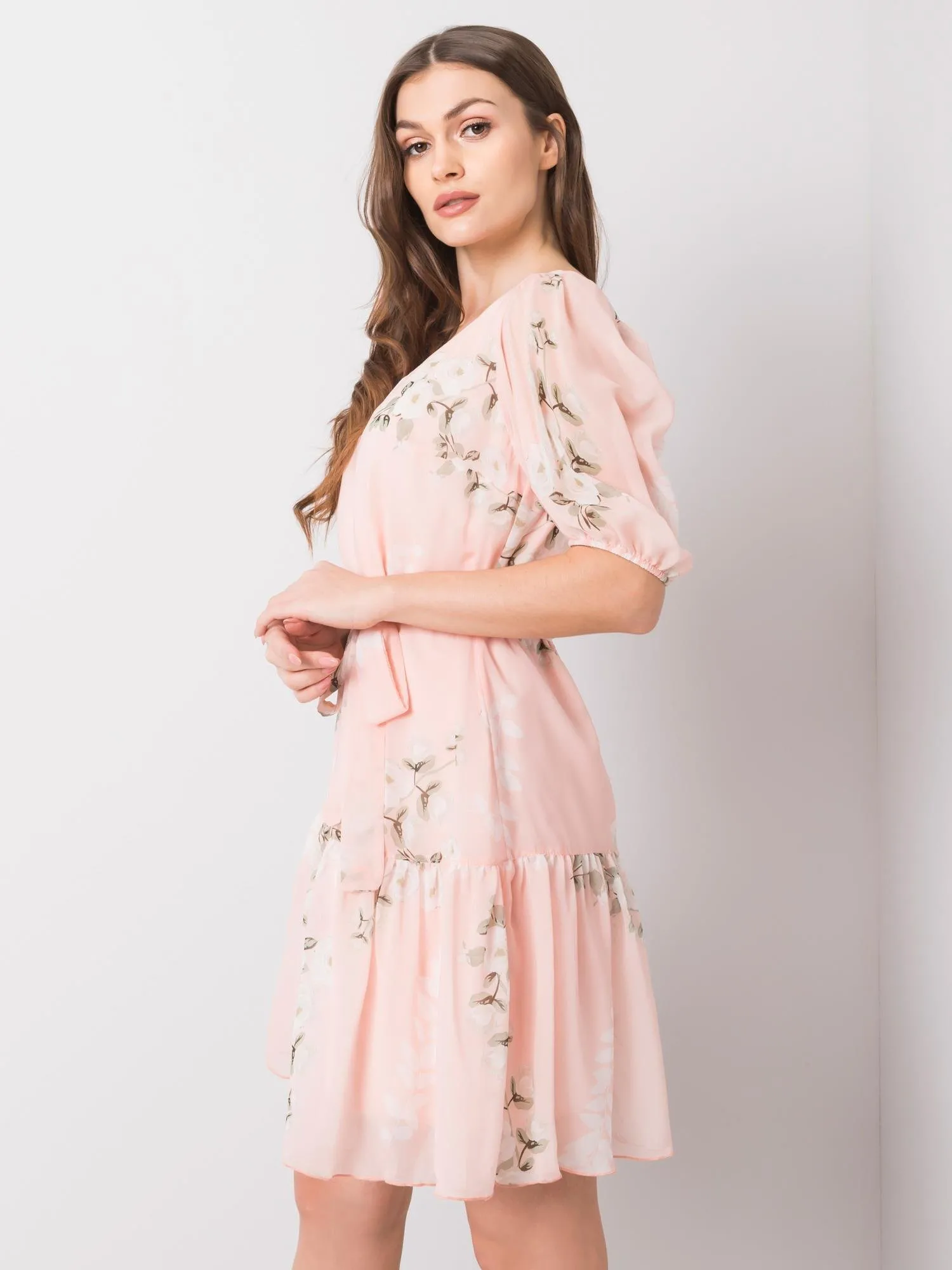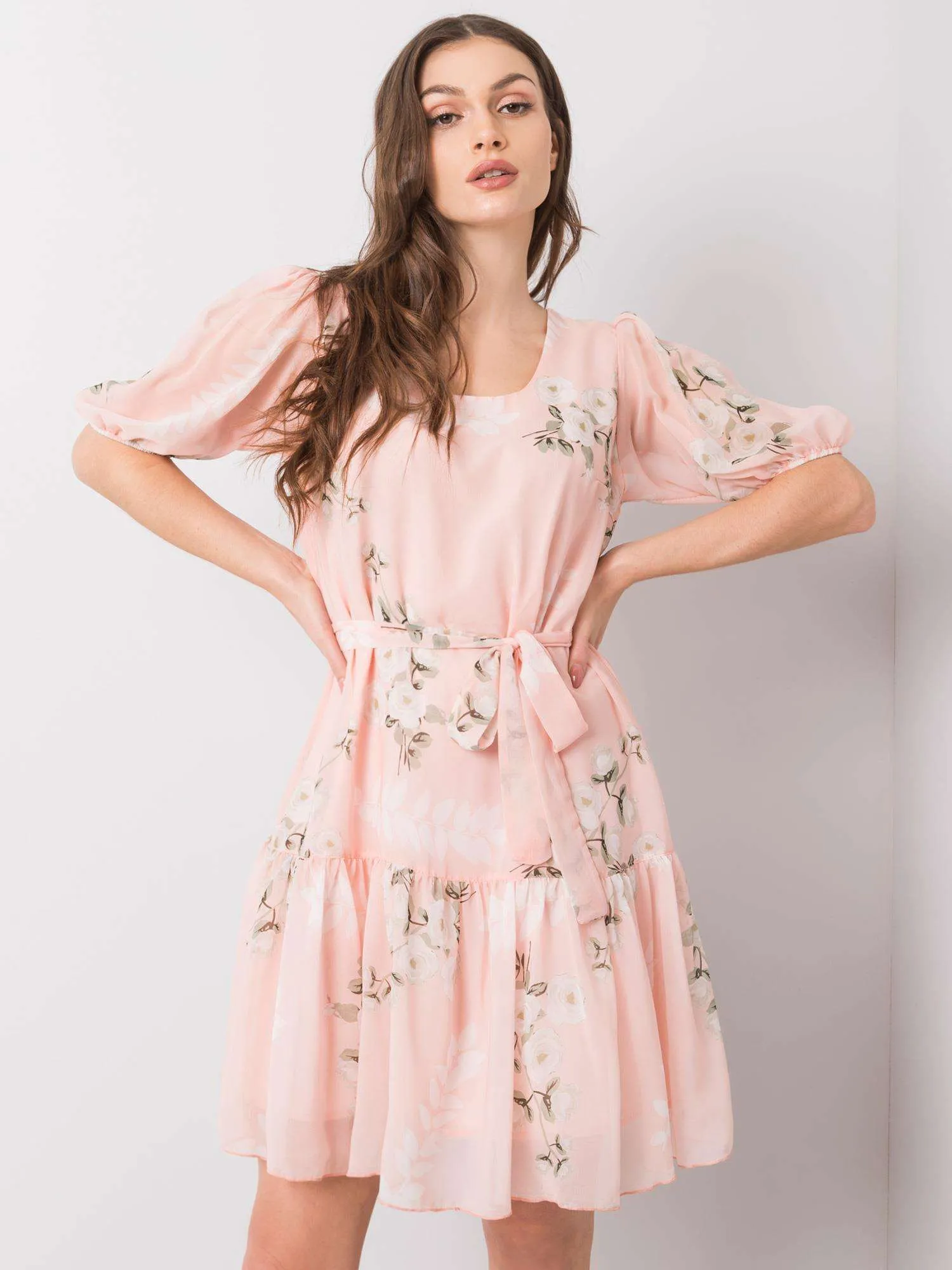 Šviesiai rožinė moteriška suknelė su gėlėmis .