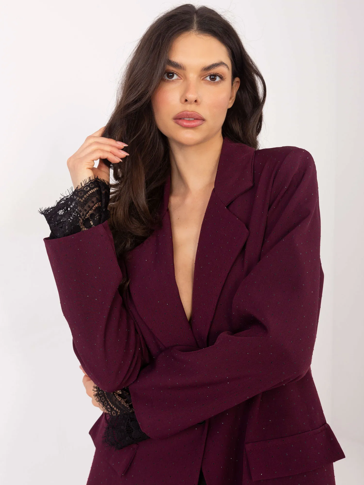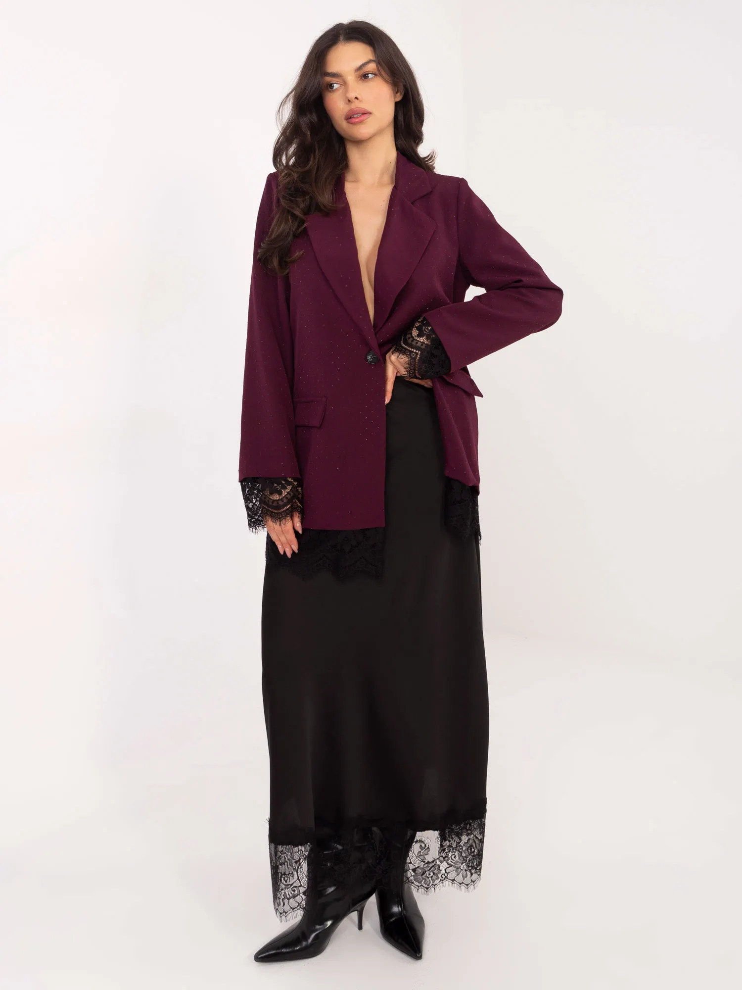 Modelis dėvi pirmąjį dydį. Modelio išmatavimai: ūgis 173 cm, krūtinės apimtis 85 cm, juosmuo 62 cm, klubai 95 cm .