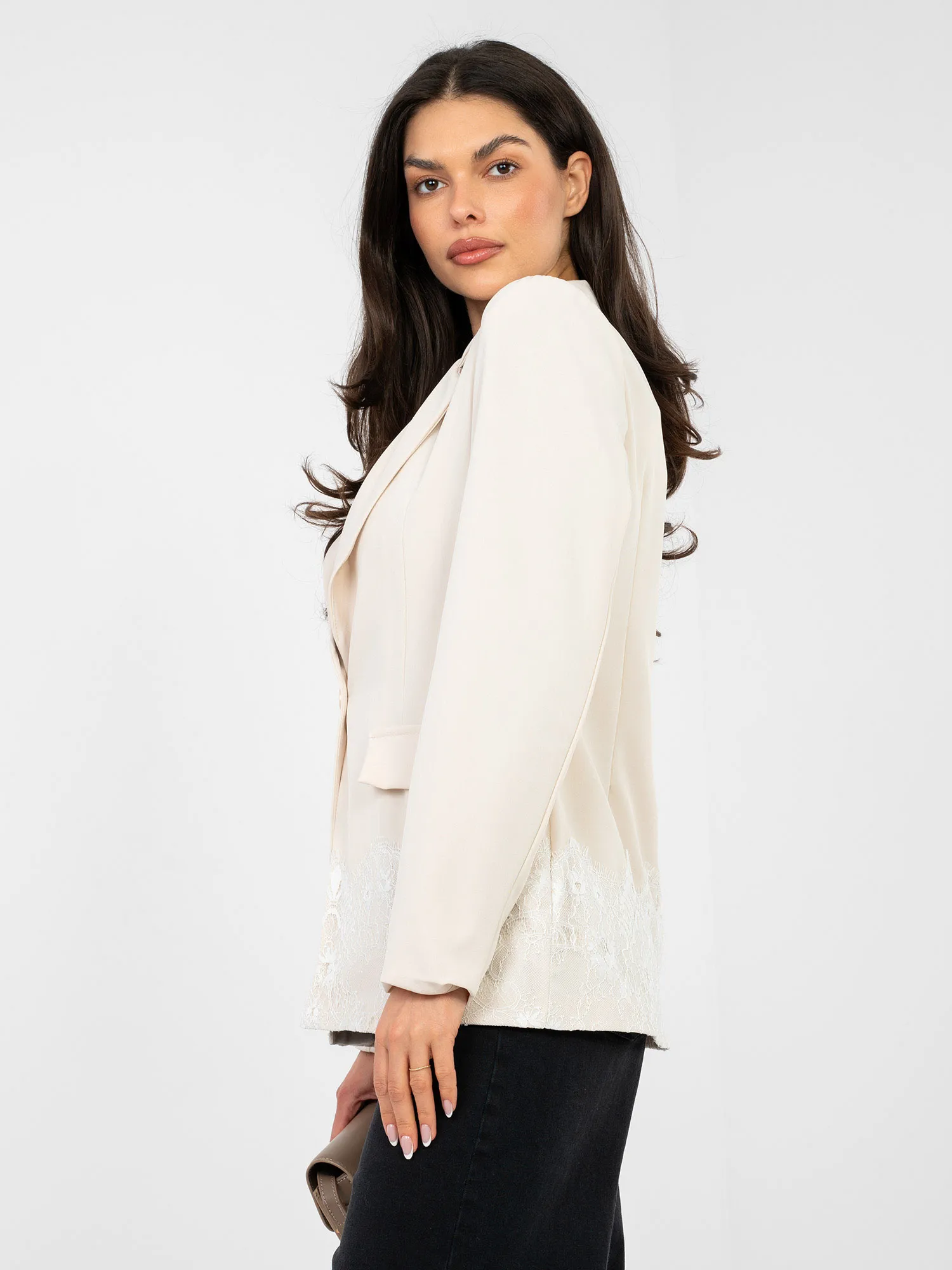 Modelis dėvi pirmąjį dydį. Modelio išmatavimai: ūgis 173 cm, krūtinės apimtis 85 cm, juosmuo 62 cm, klubai 95 cm .