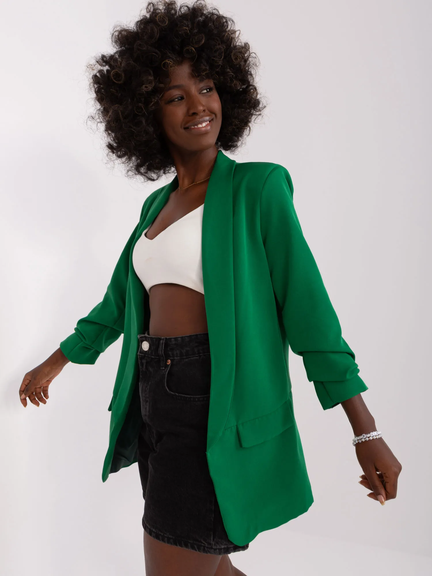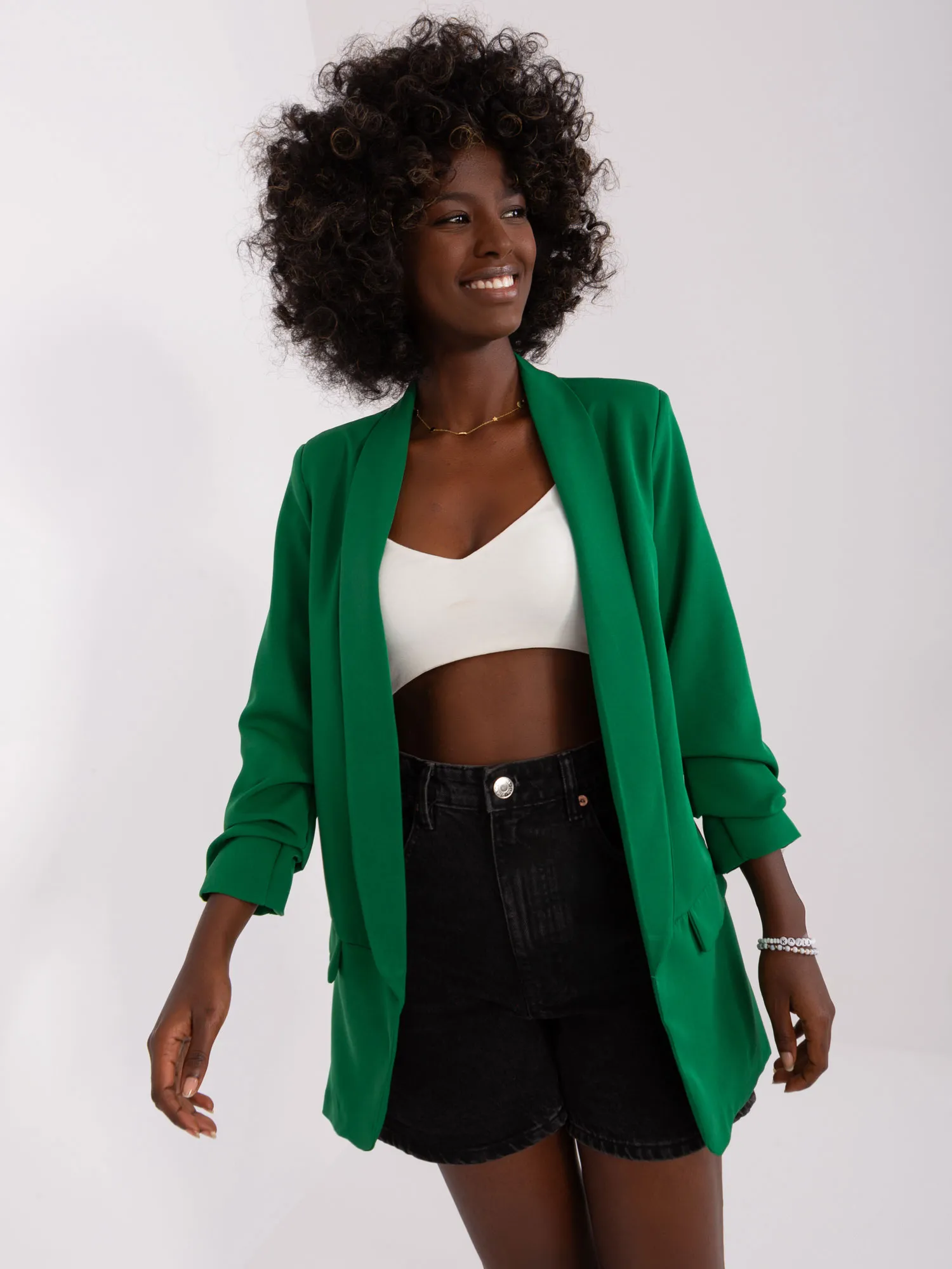 Tamsiai žalias moteriškas švarkas be užsegimo .