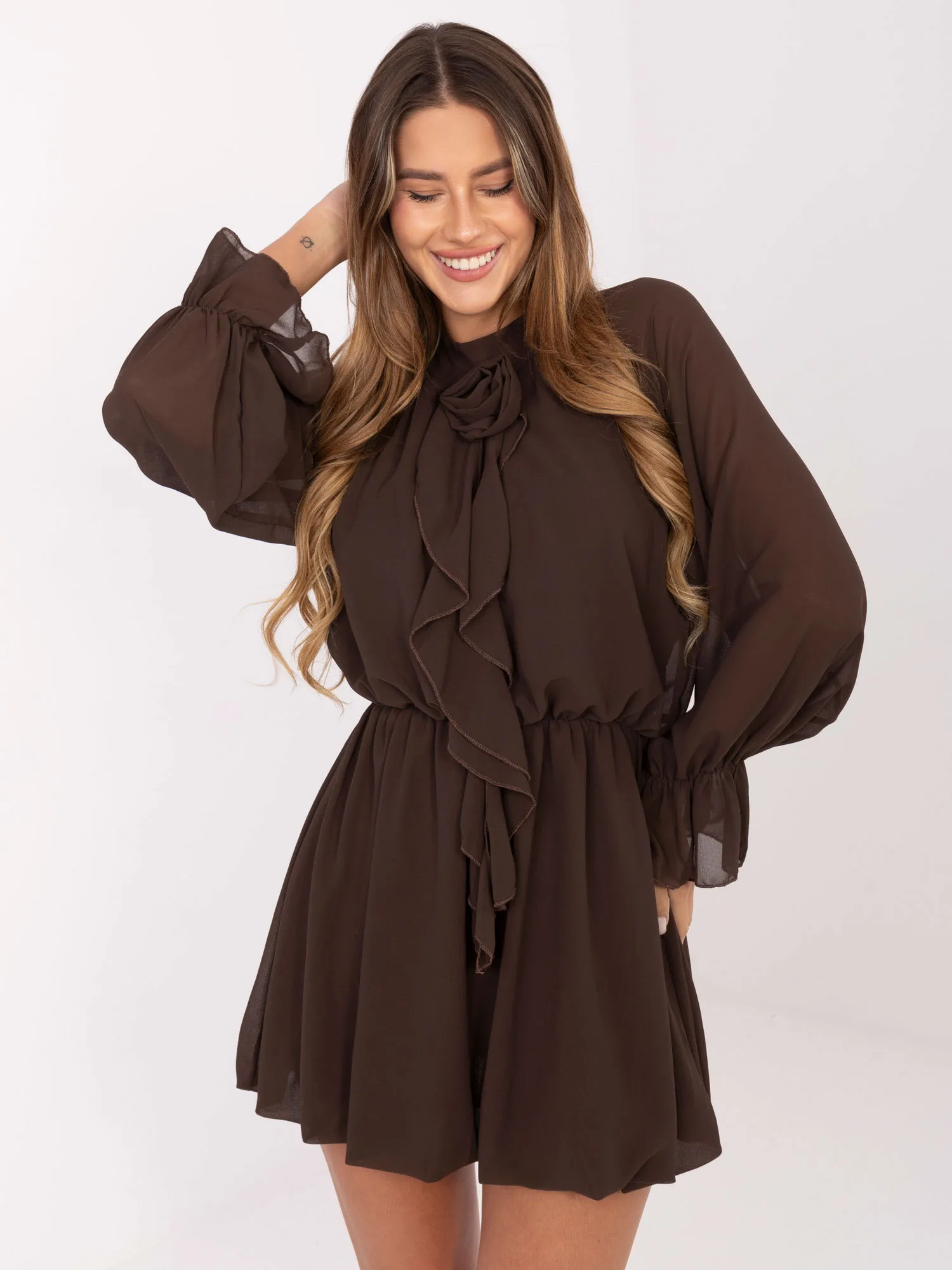 Modelka ma na sobie rozmiar one size. Wymiary modelki: wzrost 176 cm, biust 90 cm, talia 62 cm, biodra 94 cm.