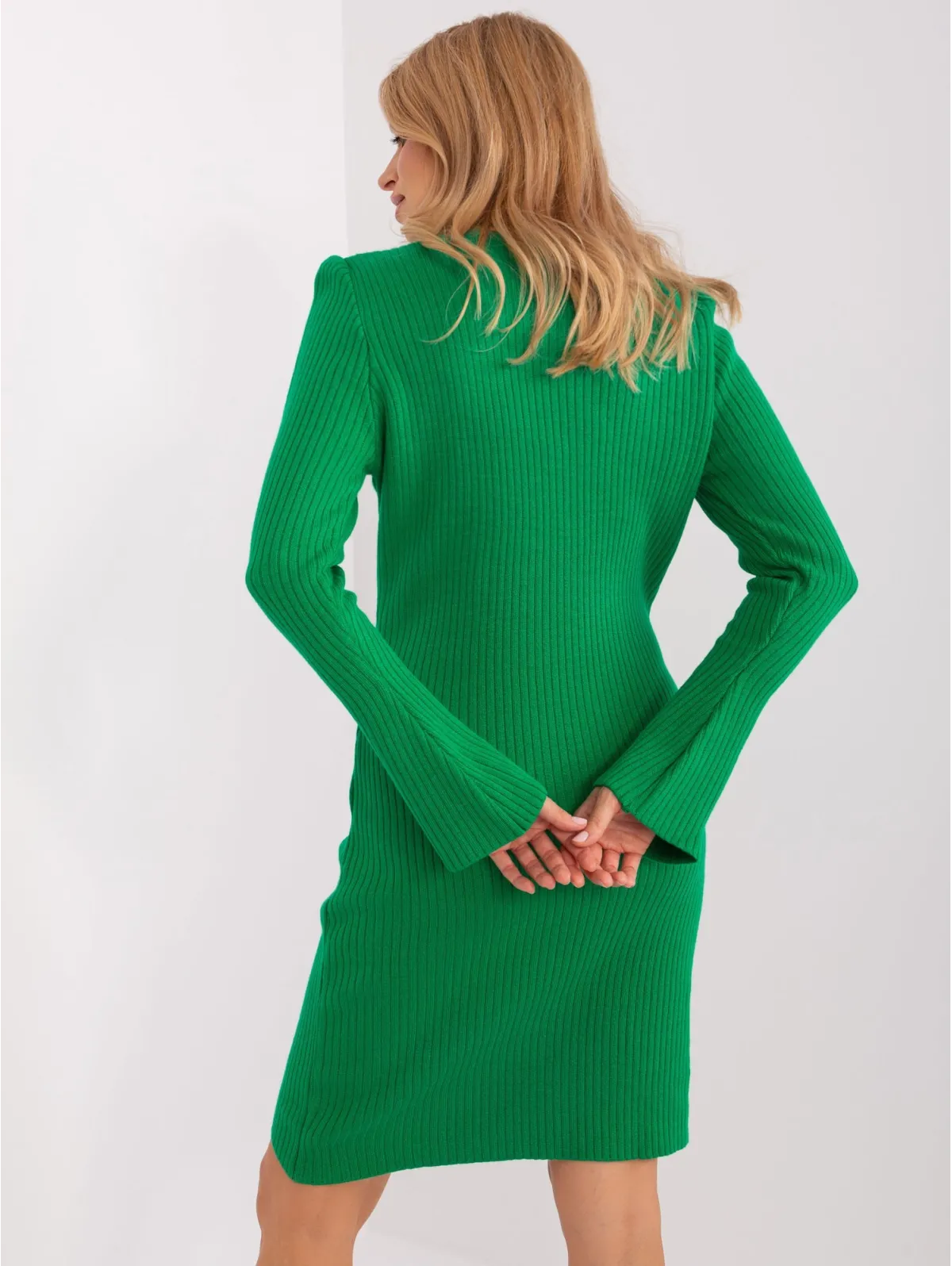 Žalia megzta suknelė varpelio rankovėmis .