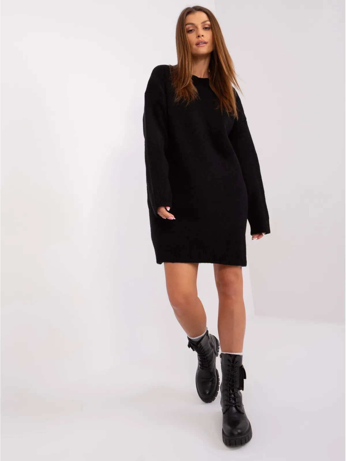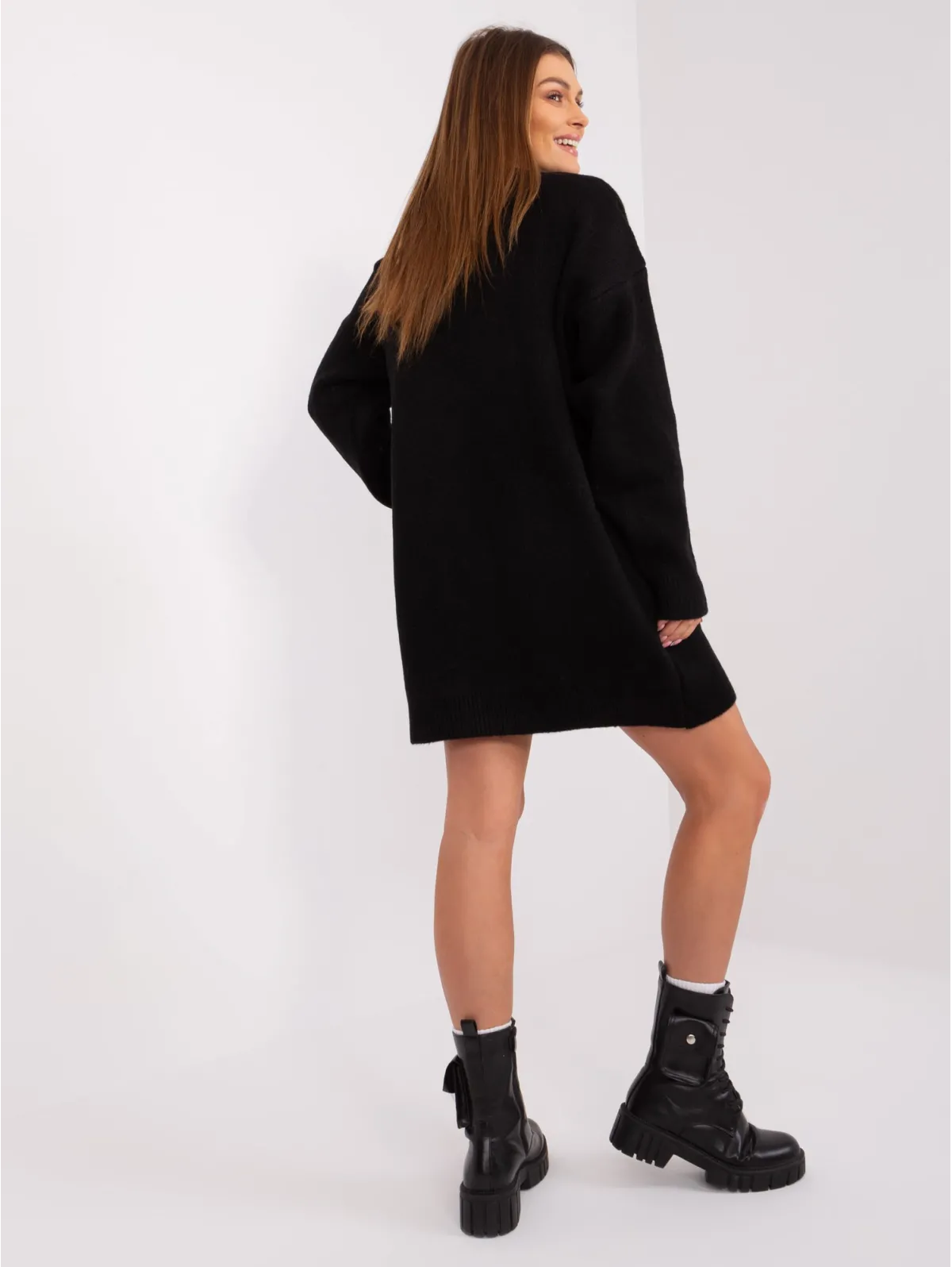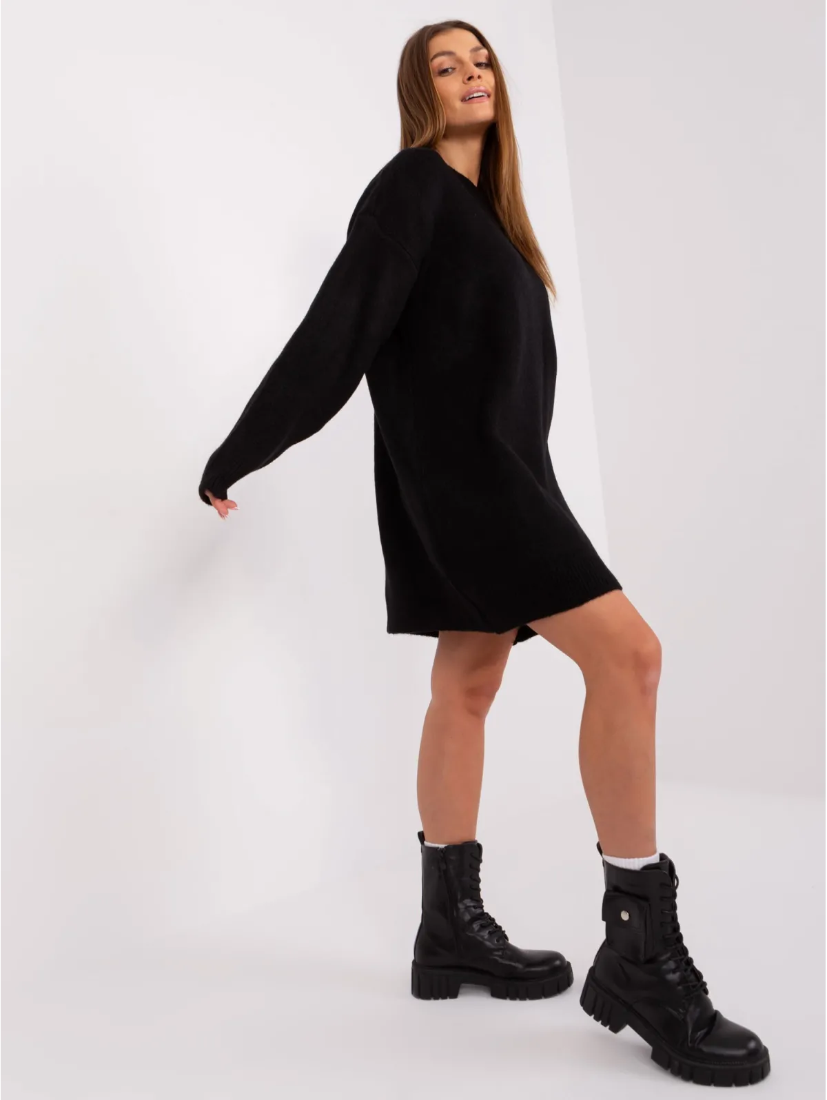 Modelis dėvi vieno dydžio dydį. Modelio išmatavimai: ūgis 170 cm, krūtinė 93 cm, juosmuo 66 cm, klubai 93 cm.