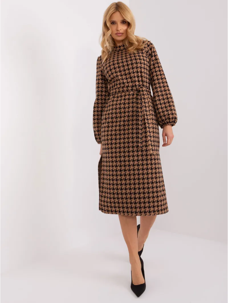 Suknelės išmatavimai M dydžio, išmatuoti plokščiai: pažasties plotis - 50 cm, bendras ilgis - 119 cm, rankovių ilgis - 60 cm.